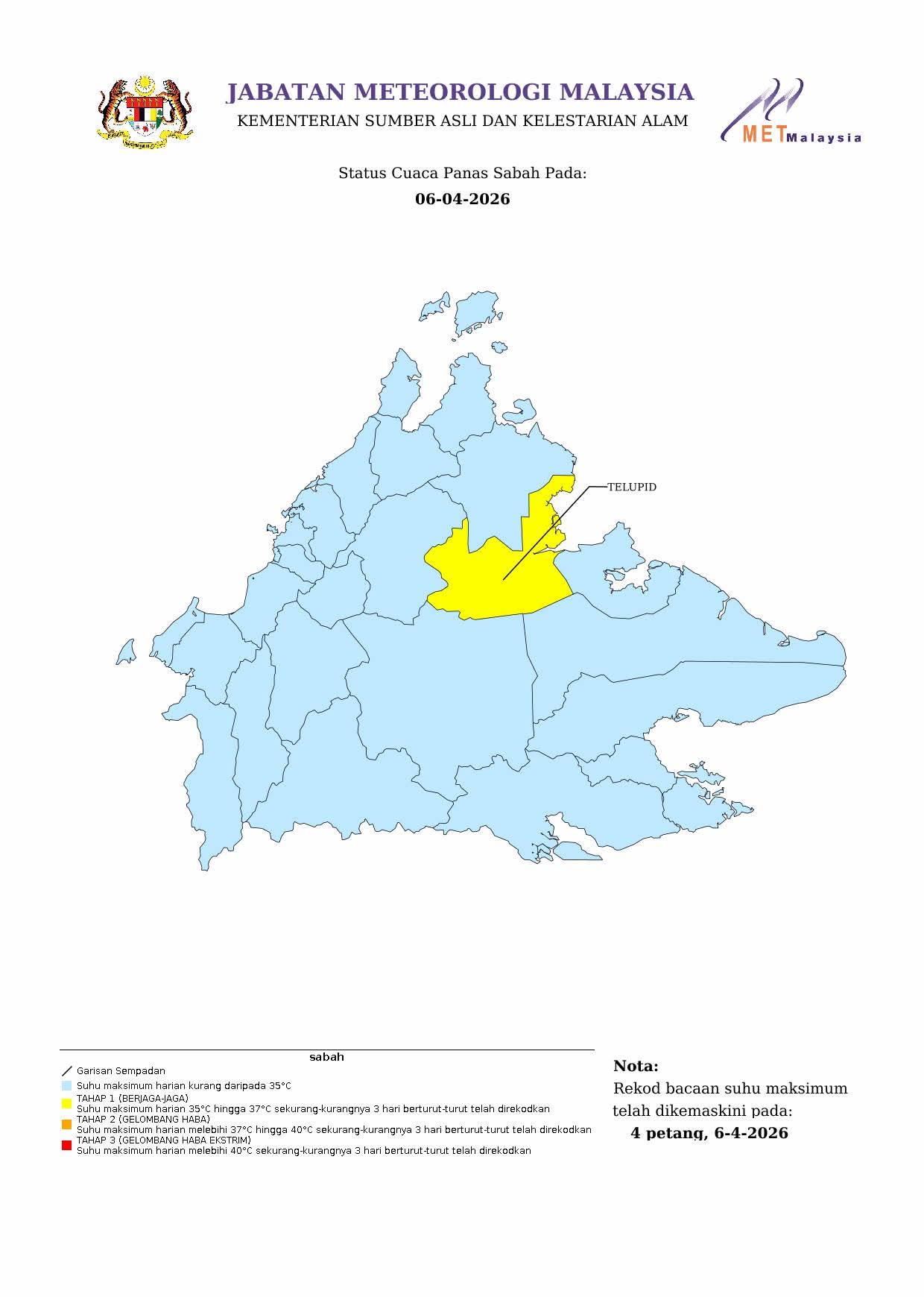 Kota Kinabalu : Daerah Telupid dilaporkam mengalami cuaca panas tahap berjaga-jaga yang boleh mencecah suhu sehingga 37 darjah celcius. Jabatan Meteorologi Malaysia (MetMalaysia) dalam satu kenyataan memaklumkan, selain Sabah, beberapa kawasan lain di Semenanjung turut dilaporkan mengalami cuaca sama sejak…
