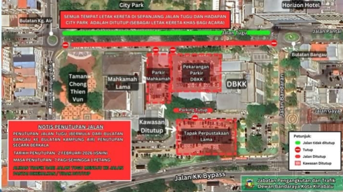 KOTA KINABALU : Dewan Bandaraya Kota Kinabalu (DBKK) akan melaksanakan penutupan sementara jalan dan tempat letak kereta di Jalan Tugu secara berkala pada Isnin.