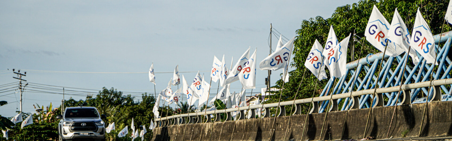 Antara bendera parti yang mula dipasang di sekitar Kampung Terawi Penampang – Foto Ivan Valens