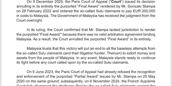 Read Time:1 Minute, 36 Second KUALA LUMPUR, Keputusan Mahkamah Rayuan Paris membatalkan sepenuhnya ‘Award Akhir’ dalam tuntutan pihak yang mendakwa sebagai waris Kesultanan Sulu terhadap Sabah disifatkan sebagai kemenangan besar kepada negara. Menteri di Jabatan Perdana Menteri (Undang-Undang dan Reformasi…