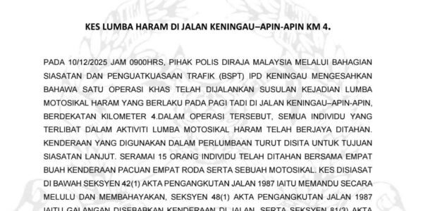 Read Time:1 Minute, 8 Second KENINGAU: Seramai 15 individu ditahan dalam satu operasi khas membanteras lumba motosikal haram yang dijalankan oleh Polis Diraja Malaysia (PDRM) di Jalan Keningau–Apin-Apin, berhampiran Kilometer 4, pagi tadi. Ketua Polis Daerah Keningau, Supt Yampil Anak…